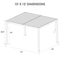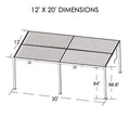 Share your best answersThe dimensions of the Kozyard Louvered Pergola are 10x12, 12x12, 12x14, 12x16, and 12x20, all available in white.