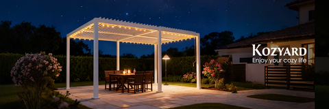 Kozyard louvered pergolas use adjustable louvers that block rain when fully closed and provide shade and airflow when opened. The aluminum frame is rust-proof and UV-resistant, making it ideal for everyday sun and rain.