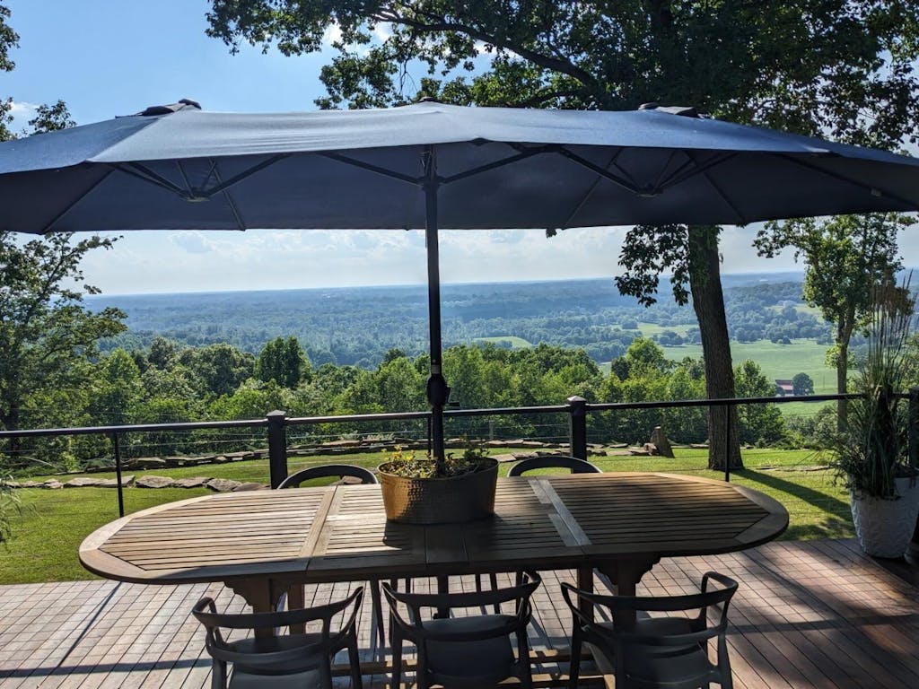 Shade needs change throughout the day; a crank system supports a simple shade-on-demand routine from lunch to early evening.